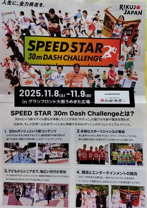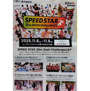 投稿日: 2025年11月 トレーニング など <11月9日【SPEED STAR 大阪大会】> 【SPEED STAR 大阪大会】ハンドボール・三橋未羽と陸上・壹岐あいこが同タイム女子優勝 現役陸上・坂井隆一郎とマスターズ陸上・寺下健治も同タイム男子優勝|SPEED STAR 30m Dash Challenge 大阪大会2日目:日本陸上競技連盟公式サイト <11月7日(土)>ウォーク、ウインド、ダッシュ、坂道 などなど with メロン&想 Presented by Nobuo Mekata
