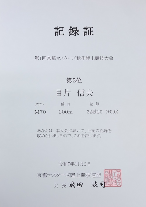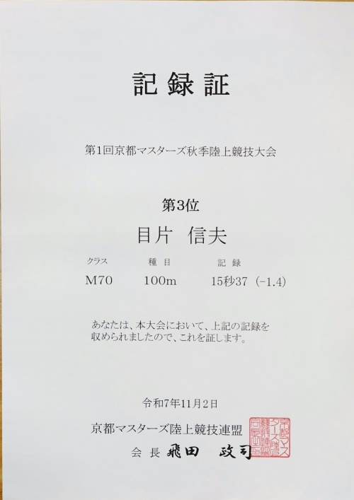投稿日: 投稿者: nobu2025年11月2日 第一回京都マスターズ秋季陸上選手権大会 寒くなく暑くなく絶好のコンディションのはずが、私の走法とタータンが合わず記録は最悪でした。順位は想定通り。 一緒に走った1位の秋〇氏も2位大〇氏も不本意な記録のようでした。 #リザルトはこちら