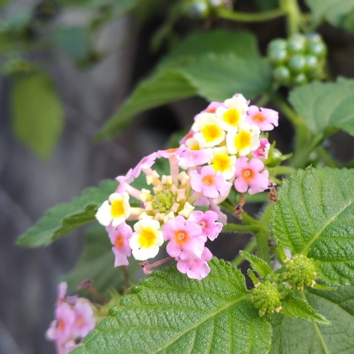 6月からずっと咲き続けています。鳥が種子を食べ散布する(種子を噛み砕く可能性の強い哺乳類には有毒だが鳥類には無毒という液果をもつ植物は多い)。学名:Lantana camara、クマツヅラ科の常緑小低木。