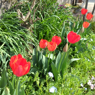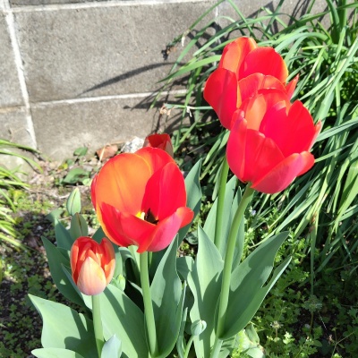 エントランスのチューリップ、今年はオレンジ系でまとめました。